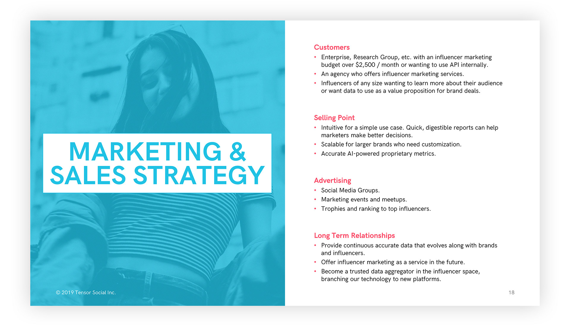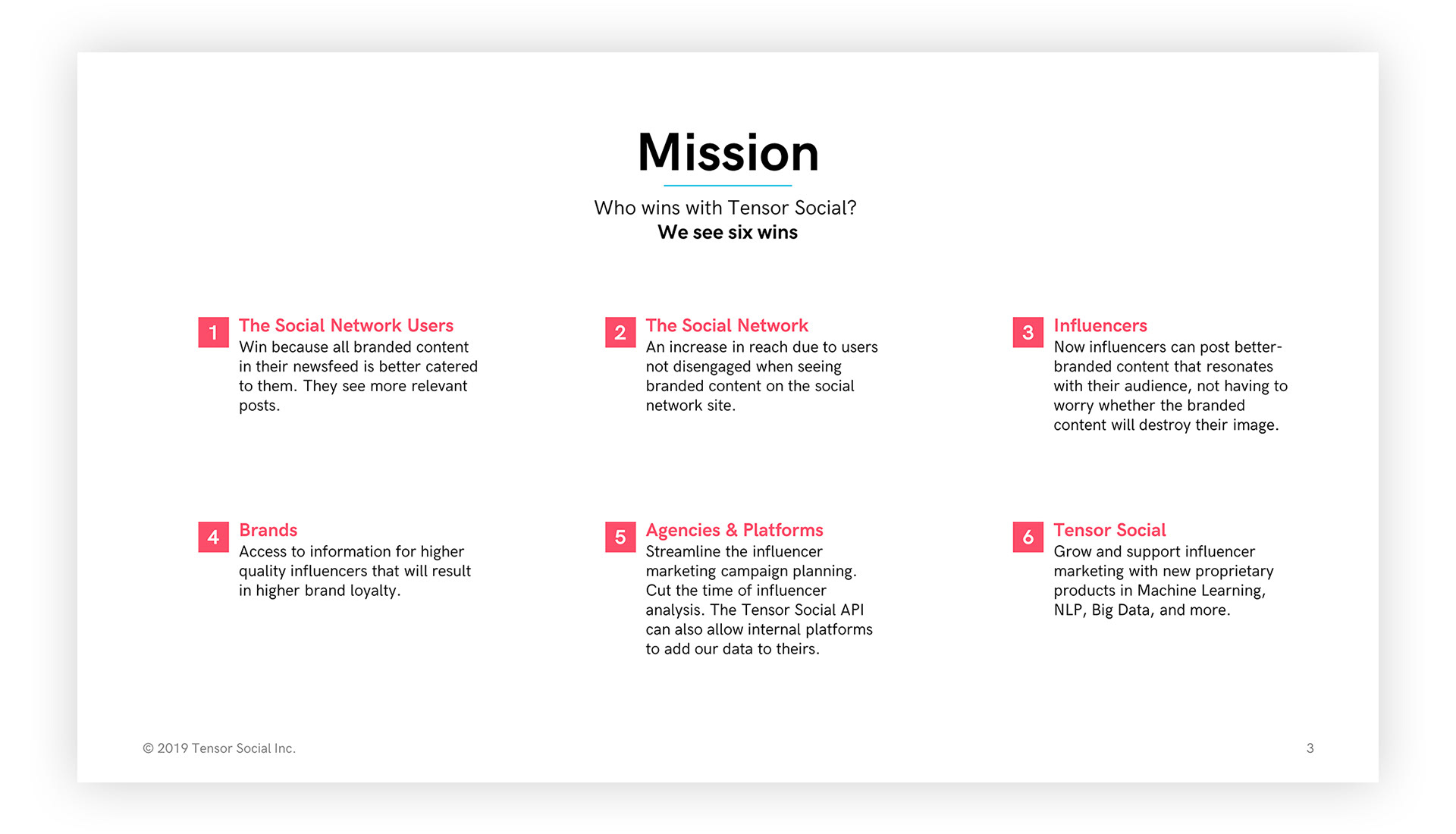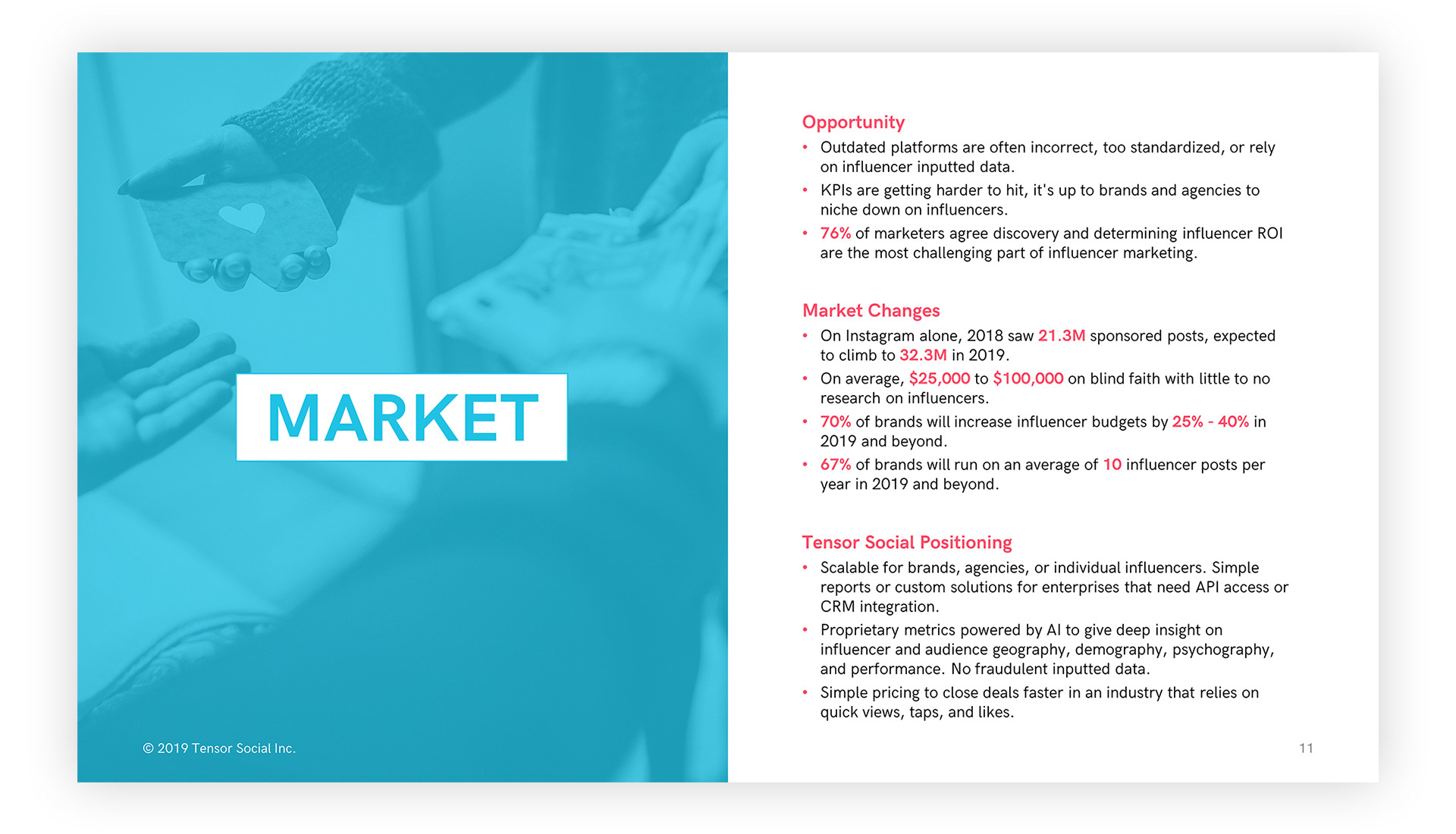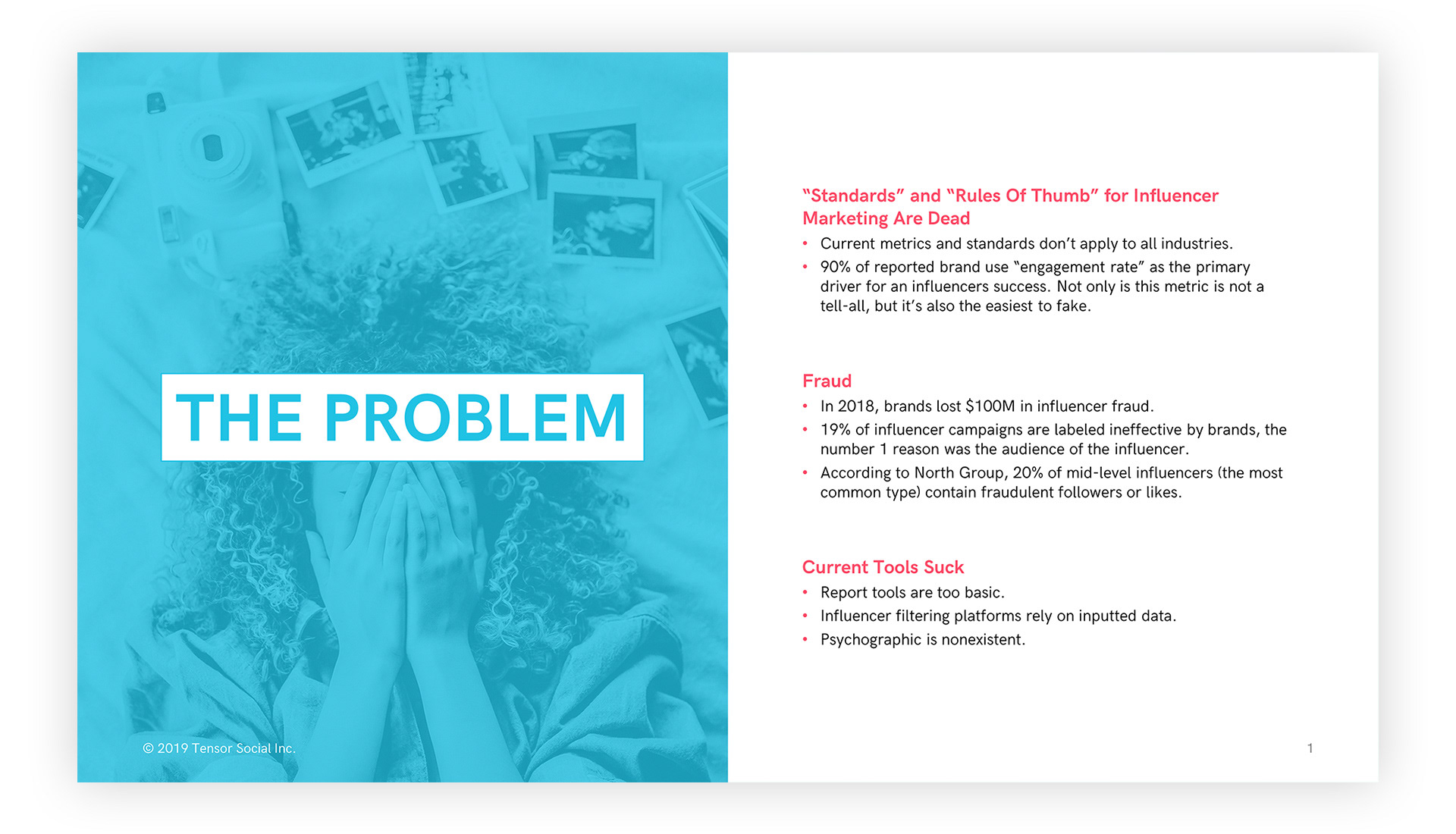 An investor pitch deck design for Tensor Social, a social media marketing tool that provides leading micro-behavioral and psychographic targeting tools for audience analysis and measurement